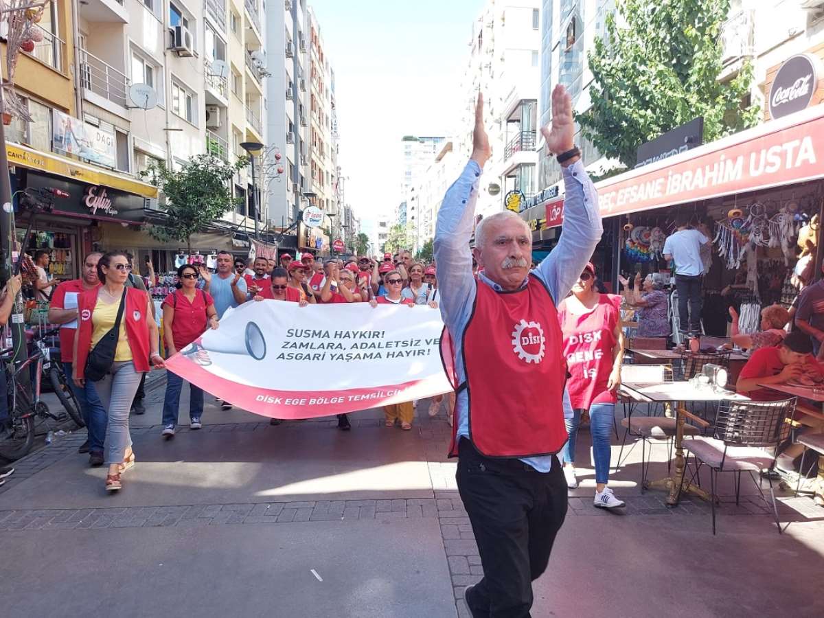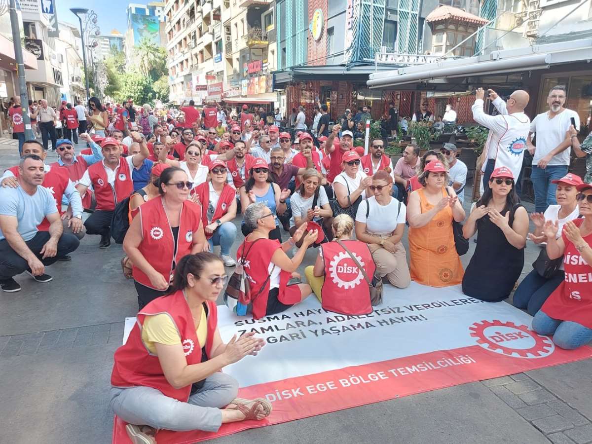 DİSK zamları protesto etmek amacıyla İzmir’de sokağa çıktı. Alsancak’ta toplanan sendika üyeleri Kıbrıs Şehitleri Caddesi boyunca “Susma haykır! Zamlara, adaletsiz vergilere, asgari yaşama hayır!” yazılı pankart açarak alkışlar ve sloganlarla yürüdü.