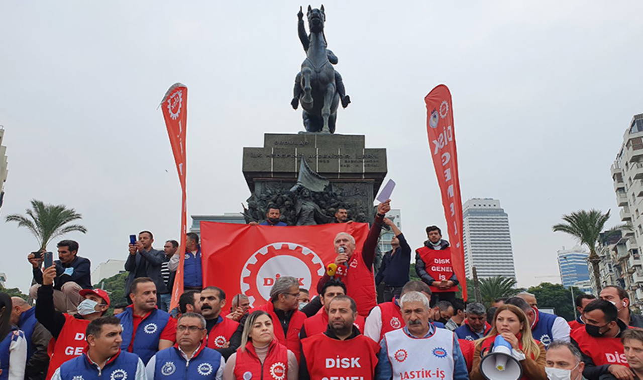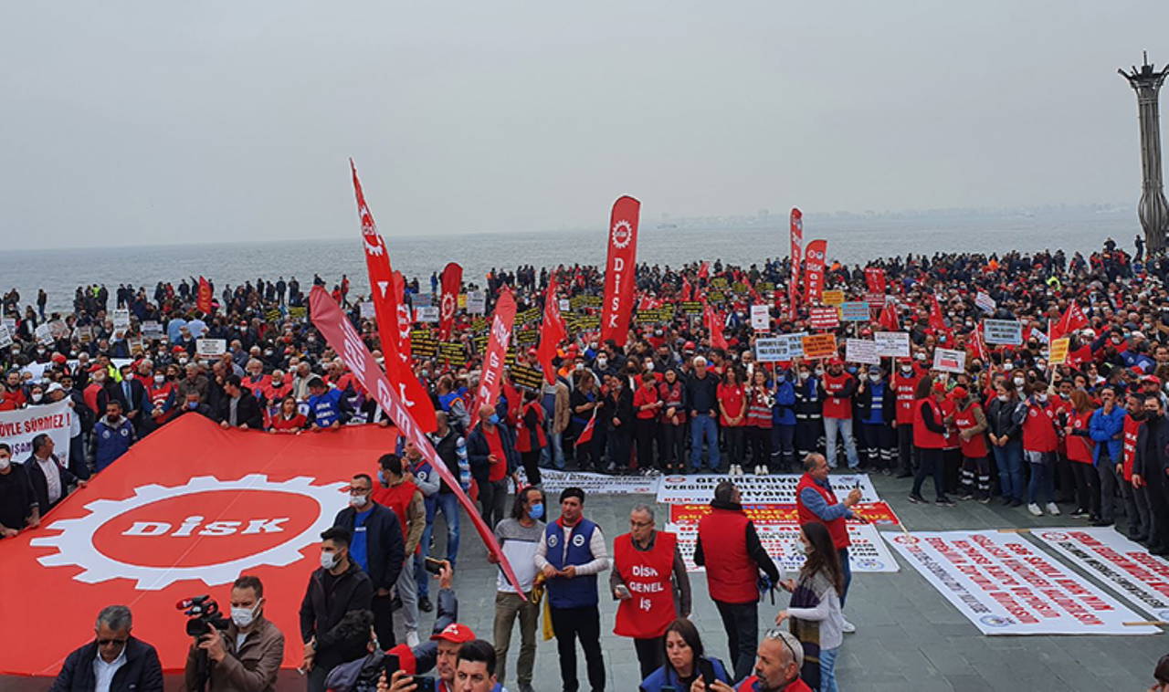 İzmir’deki mitingde hükümeti istifaya çağıran ve HAK-İŞ ve Türk-İş ile memur konfederasyonlarını genel greve davet eden DİSK Ege Bölge Temsilcisi Memiş Sarı, “Ülkeyi yönetenler ısrarla yükseliş, şahlanış masalları anlatırken bizler gerçekleri anlatıyoruz, taleplerimizi haykırıyoruz. Siz hangi yükselişten bahsediyorsunuz? Her sabah yoksulluğun ve işsizliğin arttığı bir güne uyanıyoruz. Dün aldığımızı bugün alamıyoruz. Sadece Avrupa’nın değil, dünyanın en ucuz işçilerinin yaşadığı ülkelerden biri haline geliyoruz. İşçisi çiftçisi bankalara borçlu, emeklileri aç, gençleri işsiz bir ülke yarattılar. Yeter artık! Bu kaderi biz yazmadık ama bozacak olan biziz. ‘İş bulamıyoruz’, ‘Barınamıyoruz’, ‘Geçinemiyoruz’ diyenler omuz omuza bu gidişe son vermek zorundayız. İşçinin patronundan yüksek oranda vergi verdiği bu adaletsiz düzene son vermeliyiz. Hükümetin belirlediği enflasyon ile bizim yaşadığımız enflasyon arasında dağlar kadar fark var. TÜİK’in alışveriş ettiği marketi tüm emekçiler merak ediyor. Bu ülkede öyle bir market, öyle bir pazar, öyle bir çarşı yok” dedi.