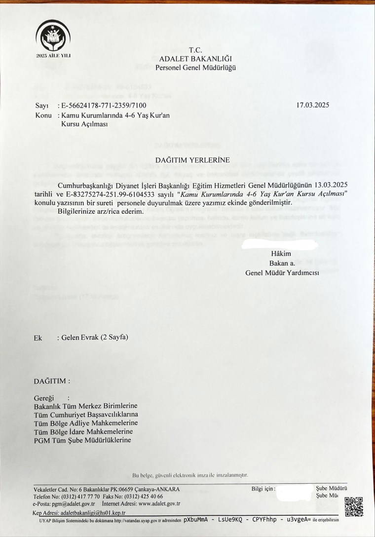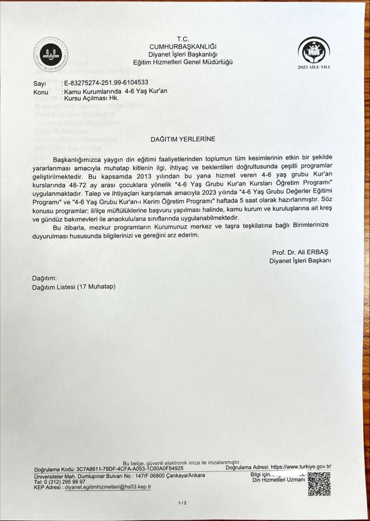 Diyanet Eğitim Hizmetleri Genel Müdürlüğü; “2025 Aile Yılı” kapsamında 13 Mart’ta 17 bakanlığa bir yazı gönderdi. Söz konusu yazıda; kamu kurum ve kuruluşlarına ait kreş, gündüz bakımevleri ve anaokullarında il-ilçe müftülüklerine başvuru yapılarak “4-6 Yaş Grubu Değerler Eğitimi Programı” ile “4-6 Yaş Grubu Kuran Öğretim Programı” kapsamında haftada 5 saat ders verilebileceği belirtildi.