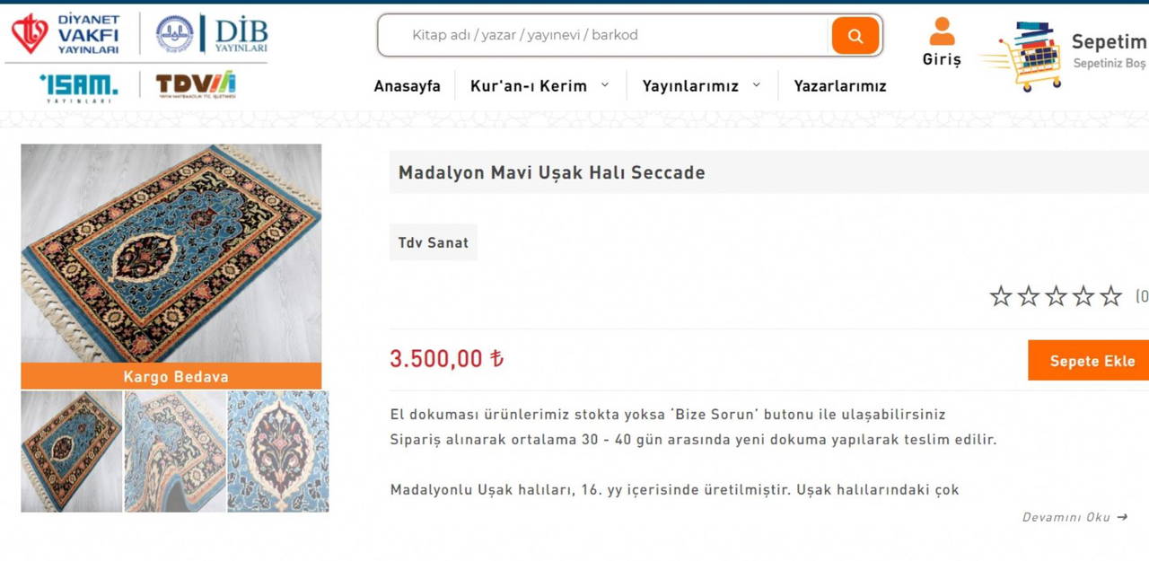 Türkiye Diyanet Vakfı aracılığıyla satışa sunulan seccadelere 3 bin 500 lira fiyat biçildi.