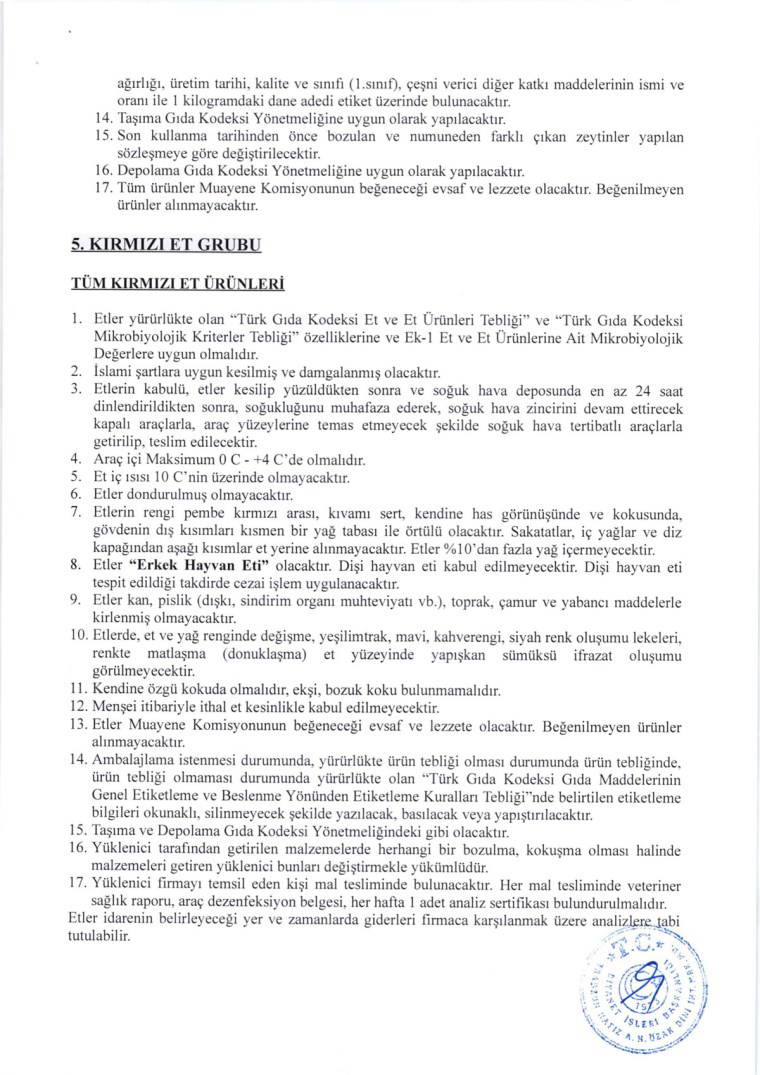 Şartnamede “Etlerin renginin pembe kırmızı arası, kıvamı sert, kendine has görünüşünde ve kokusunda, gövdenin dış kısımları kısmen bir yağ tabakası ile örtülü olacaktır. Etler yüzde 10’dan fazla yağ içermeyecektir. Etler erkek hayvan eti olacaktır. Dişi hayvan eti kabul edilmeyecektir. Dana tranç için “Butun iç tarafında leğen kemiği ile diz eklemi arasında uzanan kemiksiz adale grubundan olmalıdır. Ette kemik parçacıkları ve kıkırdak parçaları olmayacaktır” denildi.