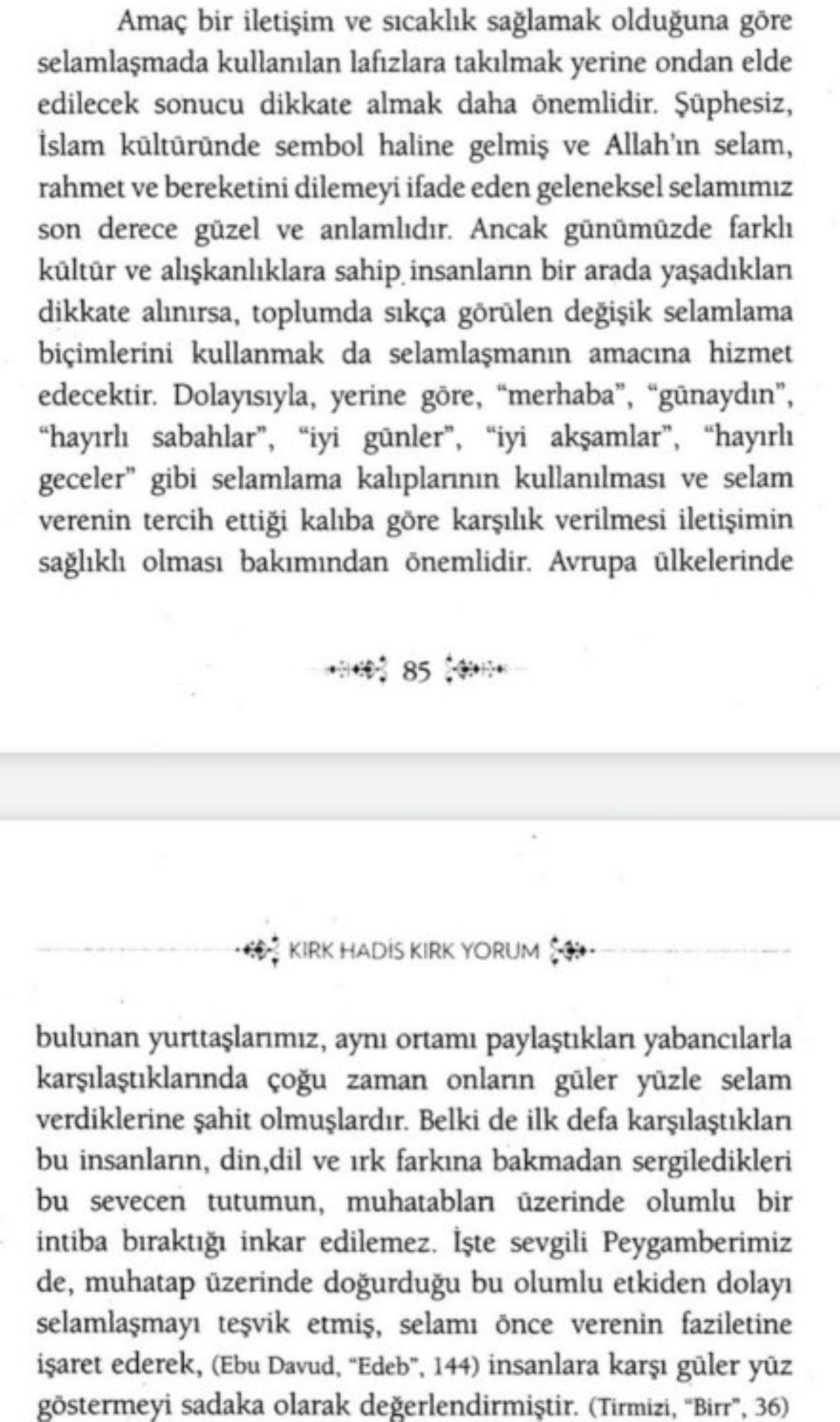 Öte yandan Diyanet İşleri Başkanlığı Yayınları'ndan çıkan, Prof. Dr. İ. Hakkı Ünal'ın kaleme aldığı "40 Hadis 40 Yorum" adlı kitapta selamlaşmaya dair dikkat çeken satırlara yer verildi.