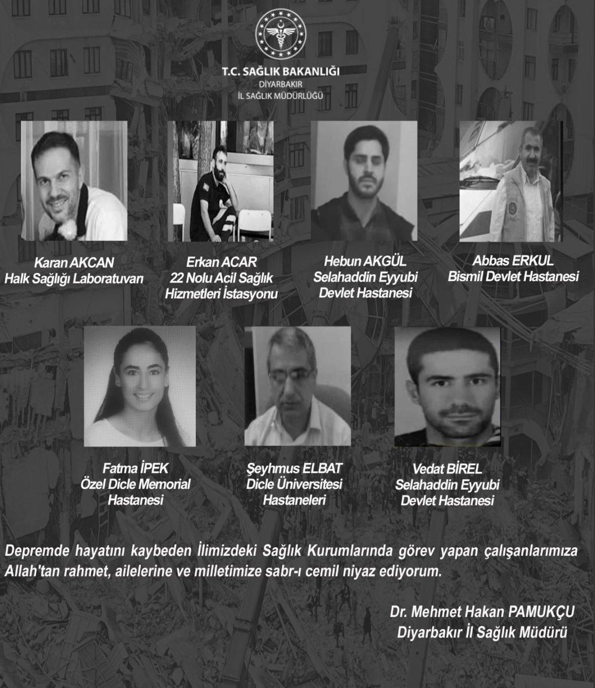 Depremlerde Diyarbakır'da görev yapan sağlık çalışanlarından Karan Akcan, Erkan Acar, Hebun Akgül, Abbas Erkul, Fatma İpek, Şeyhmus Elbat ve Vedat Birel enkaz altında kalarak hayatını kaybetti.