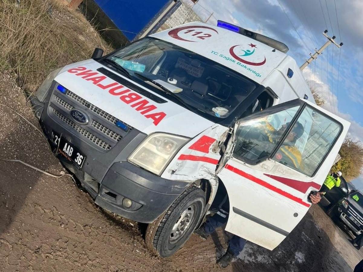 Çarpmanın etkisiyle yol kenarına savrulan ambulansta bir sağlık personeli hafif yaralandı.