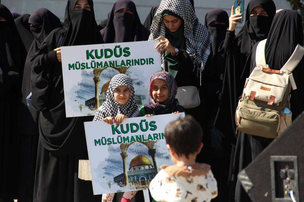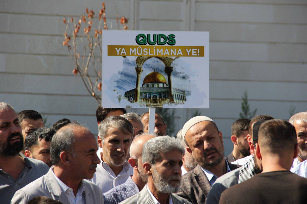Ulu Cami önünde toplanan bir grup, Filistin bayrakları açıp, "Filistin'e selam direnişe devam" sloganları attı. Dua eden grup, daha sonra Filistin'e destek çağrısı yaptı.