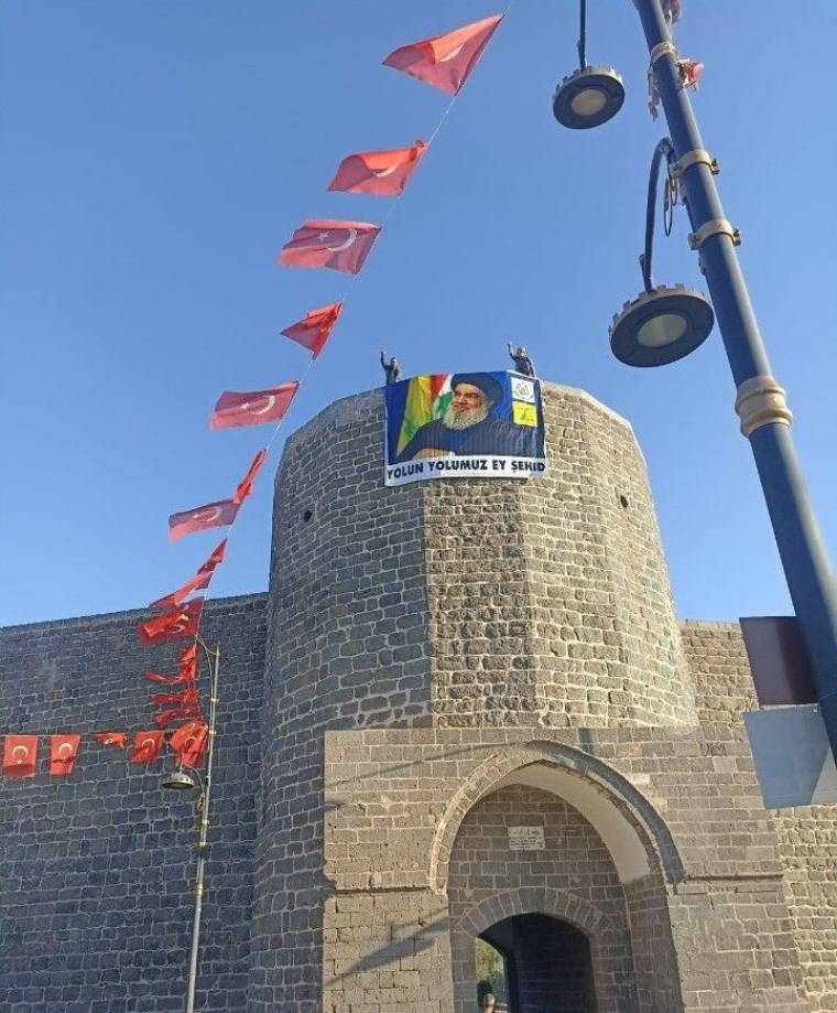 Diyarbakır’da bir grup, İsrail’in 2 gün önce Lübnan'ın başkenti Beyrut'a düzenlediği hava saldırısında hayatını kaybeden Hizbullah lideri Hasan Nasrallah’ın dev posterini, tarihi surlara astı.