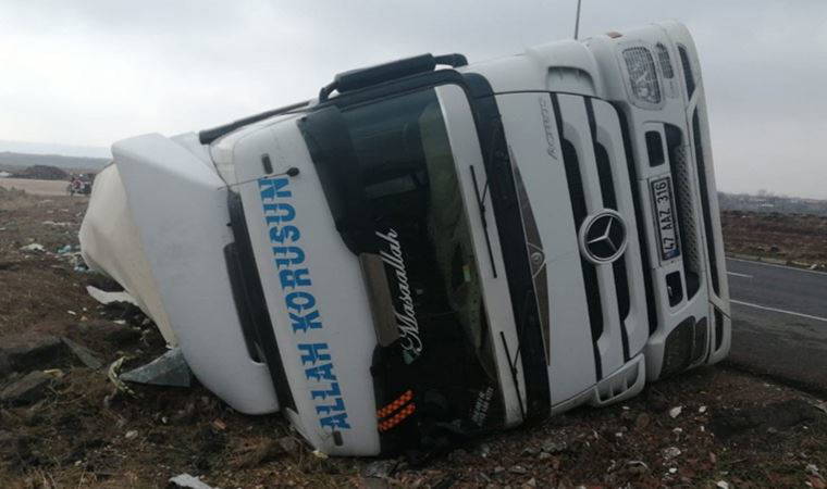 Diyarbakır -Mardin Karayolu Havalimanı kavşağında meydana gelen kazada iddiaya göre, 47 AZ 316 plakalı Mercedes marka TIR, kavşağa girdiği sırada sürücüsünün direksiyon hakimiyetinin kaybetmesi sonucu devrildi. Devrilen TIR'da sıkışan araç sürücüsü çevredekilerin ihbarı üzerine olay yerine gelen sağlık ekipleri tarafından olay yerinde ilk müdahalesi yapıldıktan sonra en yakın hastaneye kaldırılarak tedavi altına alındı.