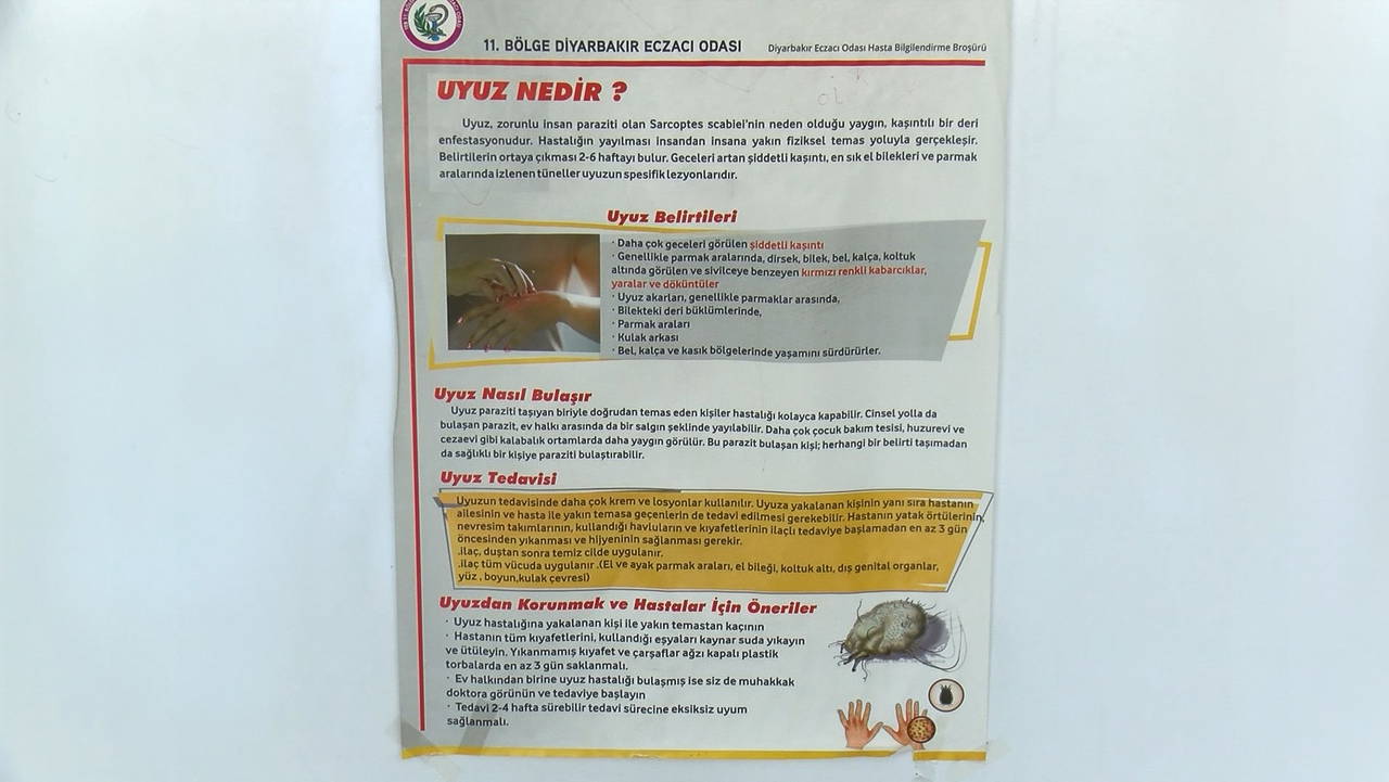 Koronavirüsün yanı sıra uyuz vakalarının da artışı Diyarbakırlıları tedirgin ederken, eczanelere 'Uyuz nedir' başlıklı hastalığı anlatan broşür asıldı.
