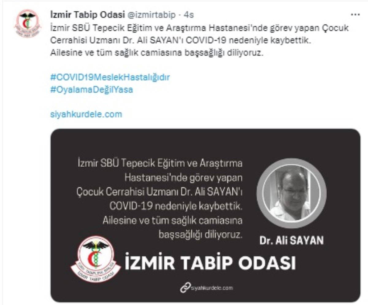 İzmir Tabip Odası'nın sosyal medya hesabından yapılan açıklamada da "SBÜ Tepecik Eğitim ve Araştırma Hastanesi'nde görev yapan Çocuk Cerrahisi Uzmanı Dr. Ali SAYAN'ı COVID-19 nedeniyle kaybettik. Ailesine ve tüm sağlık camiasına başsağlığı diliyoruz." denildi.
