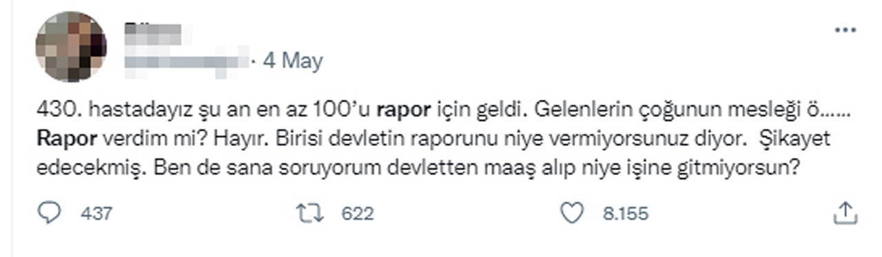 “430'uncu hastadayız şu an en az 100'ü rapor için geldi. Gelenlerin çoğunun mesleği öğretmen. Rapor verdim mi? Hayır. Birisi 'Devletin raporunu niye vermiyorsunuz' diyor. Şikayet edecekmiş. Ben de sana soruyorum 'Devletten maaş alıp niye işine gitmiyorsun?' Gelenlerin çoğu öğretmen. Kendiniz bunu bizden daha iyi biliyorsunuz. 'Hocam bilet almadım, hocam ailemden uzaktayım, hocam 4 saatlik ders var sadece.' İşinin başında olanlara lafım yok. Ve dün ülkenin çoğu acili böyleydi. Durum böyleyken hala neyin aksini ispat etmeye çalışıyorsunuz"