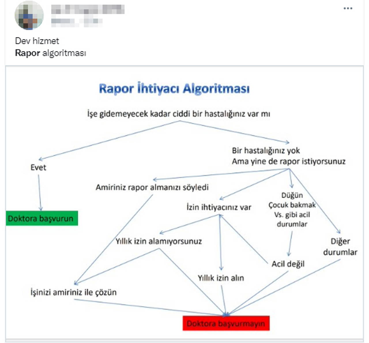 Bir doktor ise aşırı rapor talepleri nedeniyle, hangi durumda rapor verilebileceği, hangi durumlarda verilemeyeceğini gösteren bir 'Rapor İhtiyacı Algoritması' oluşturdu. İşe gidemeyecek kadar ciddi hastalığı olanların doktoruna başvurabileceğini, izin ihtiyacı, düğün, çocuk vs gibi acil durumlar gibi bir hastalığı olmayıp ama yine de rapor isteyenlerin doktora başvurmaması gerektiğine yer verdi.