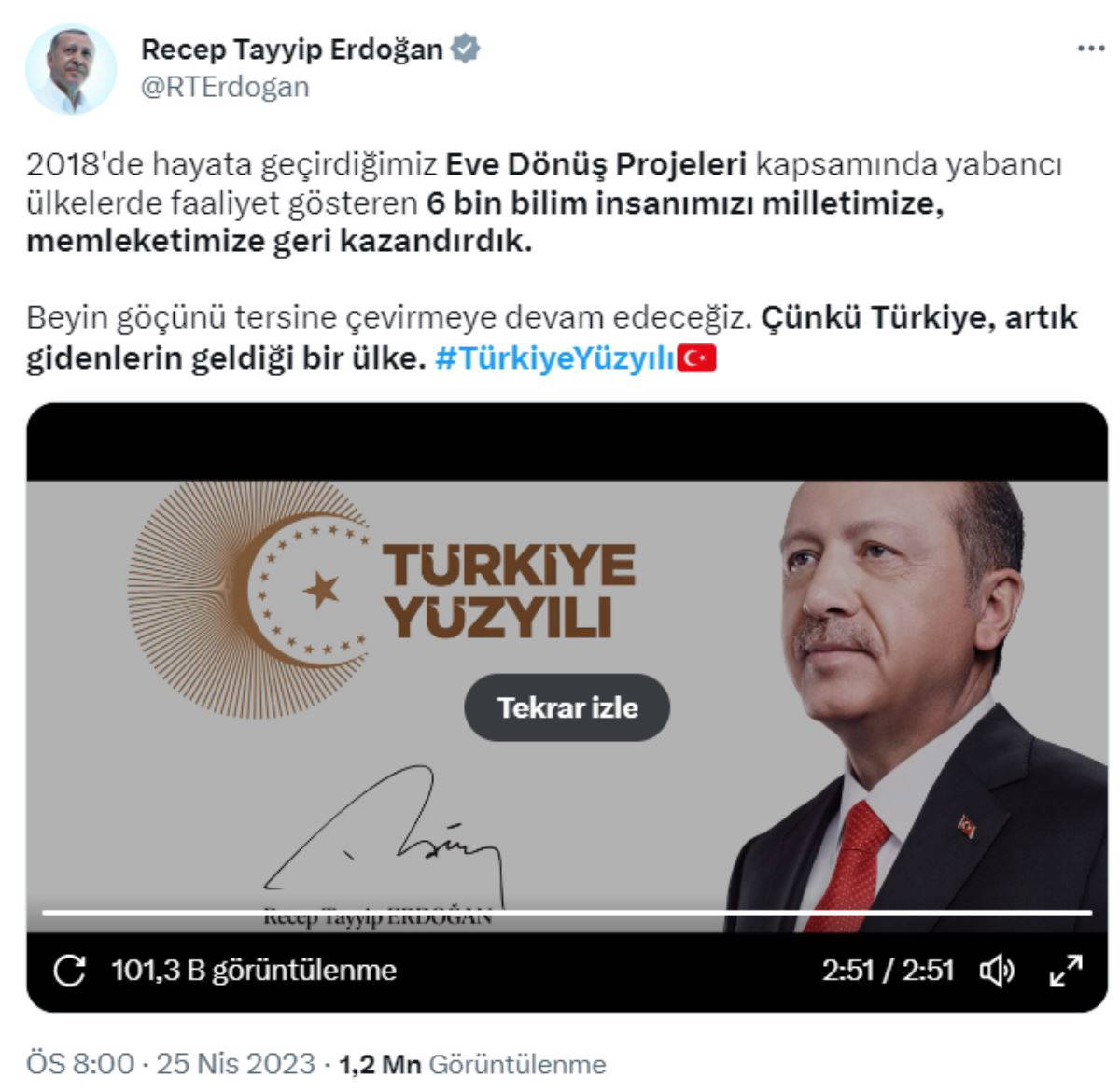Videolu paylaşımında, 2018'de hayata geçirilen 'Eve Dönüş Projeleri' kapsamında yabancı ülkelerde faaliyet gösteren 6 bin bilim insanının geri kazandırıldığını ifade eden Erdoğan, "Beyin göçünü tersine çevirmeye devam edeceğiz. Çünkü Türkiye, artık gidenlerin geldiği bir ülke" dedi.