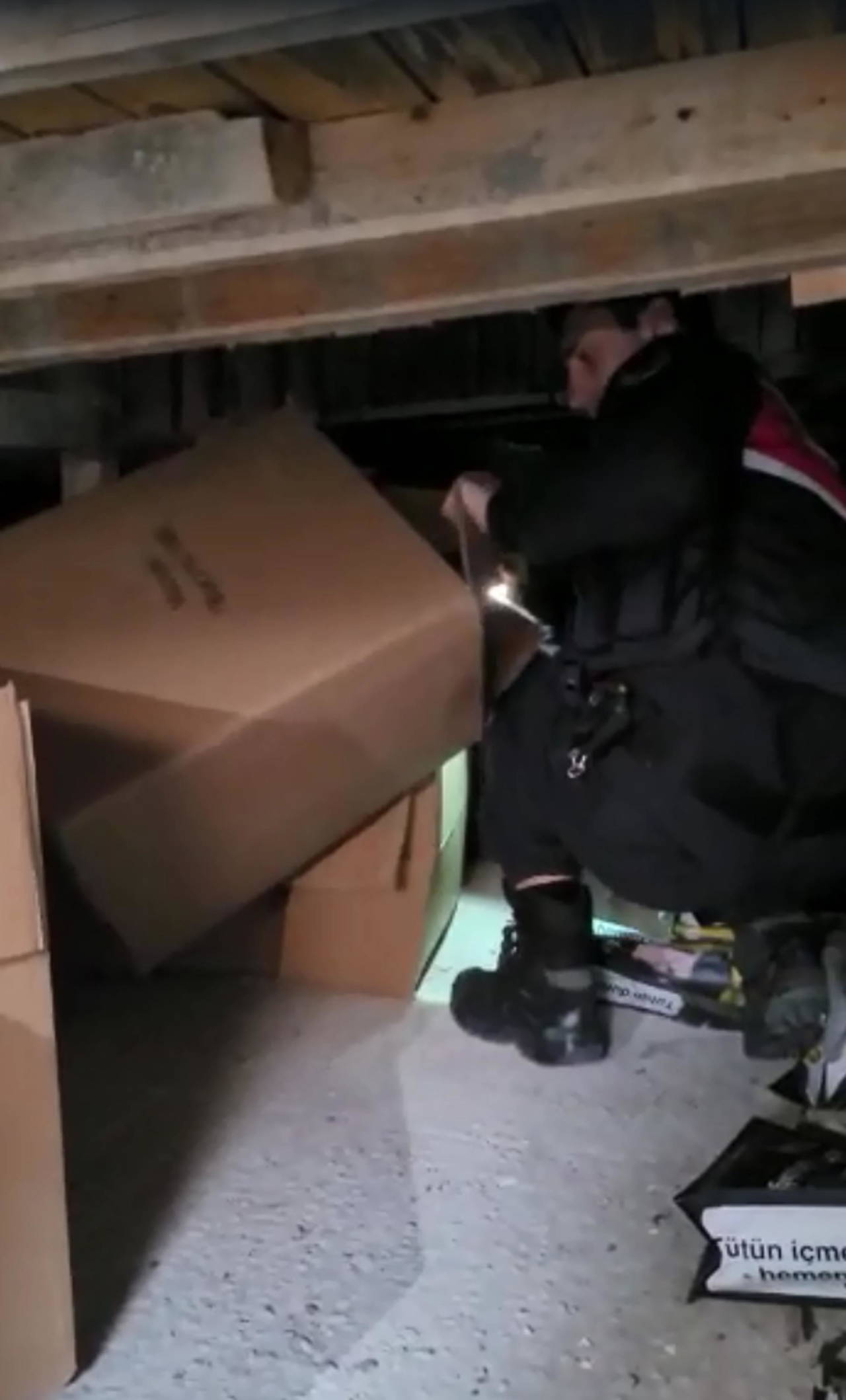 Gizli bölüme girip arama yapan jandarma ekipleri, 62 bin 500 dolu ve boş makaron, 42 kilo kıyılmış tütün ve tam otomatik elektrikli makaron doldurma makinesi ele geçirdi.