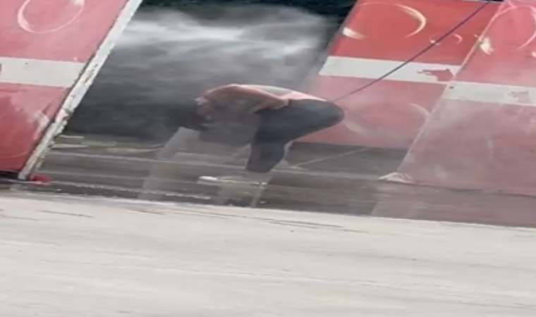 Dakikalarca tazyikli suyla yıkanan kadın sırılsıklam olurken, vatandaşlar ise o ilginç anları cep telefonu kamerasıyla kaydetti.