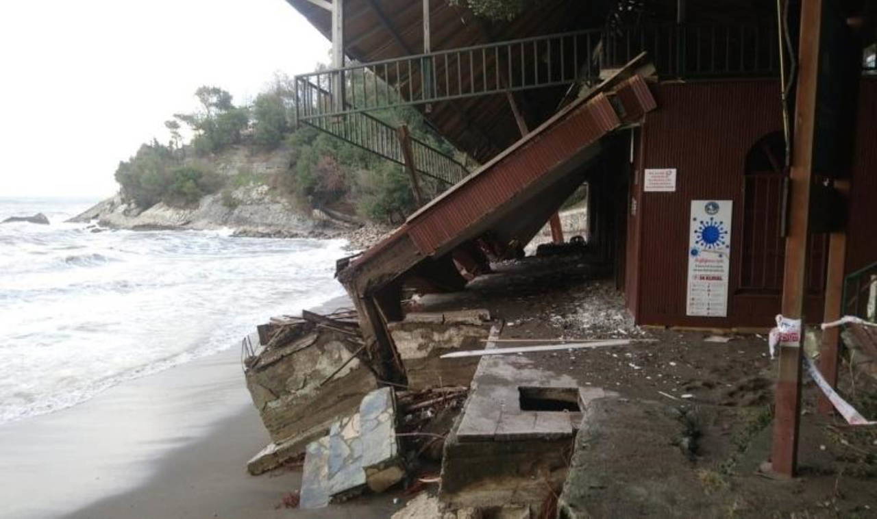 Akçakoca ilçesinde dün gece etkili olan ve saatteki hızı 100 kilometreyi bulan fırtınayla birlikte 7 metreye ulaşan dalgalar, Ceneviz Kalesi'ndeki Akçakoca Belediyesi'ne ait plaj tesisinde hasara neden oldu. Çatısı uçan tesisin ön kısmı da yıkıldı.