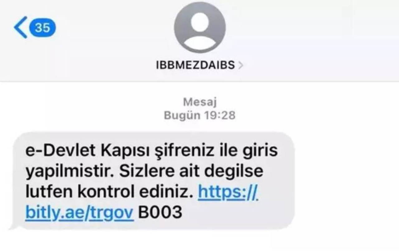 Gönderen yerine 'IBBMEZDAIBS' yazılan kısa mesajda "e-Devlet Kapısı şifreniz ile giriş yapılmıştır. Sizlere ait değilse lütfen kontrol ediniz" ifadeleri yer aldı.