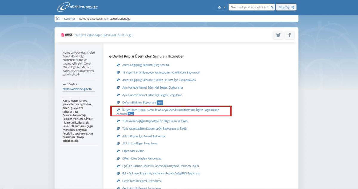İçişleri Bakanlığı Nüfus ve Vatandaşlık İşleri Genel Müdürlüğü e-hizmetlerine bir yenisini ekleyerek “İl/İlçe İdare Kurulu Kararı ile Ad veya Soyadı Düzeltilmesine İlişkin Başvuruların Alınması” hizmetini E-Devlet Kapısına taşıdı.