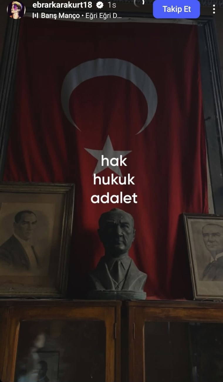 Instagram hesabından bir paylaşım yapan Karakurt, Barış Manço'nun 'Eğri Eğri Doğru Doğru' şarkısını kullanarak 'hak, hukuk, adalet' ve Atatürk temalı bir görsel kullandı.