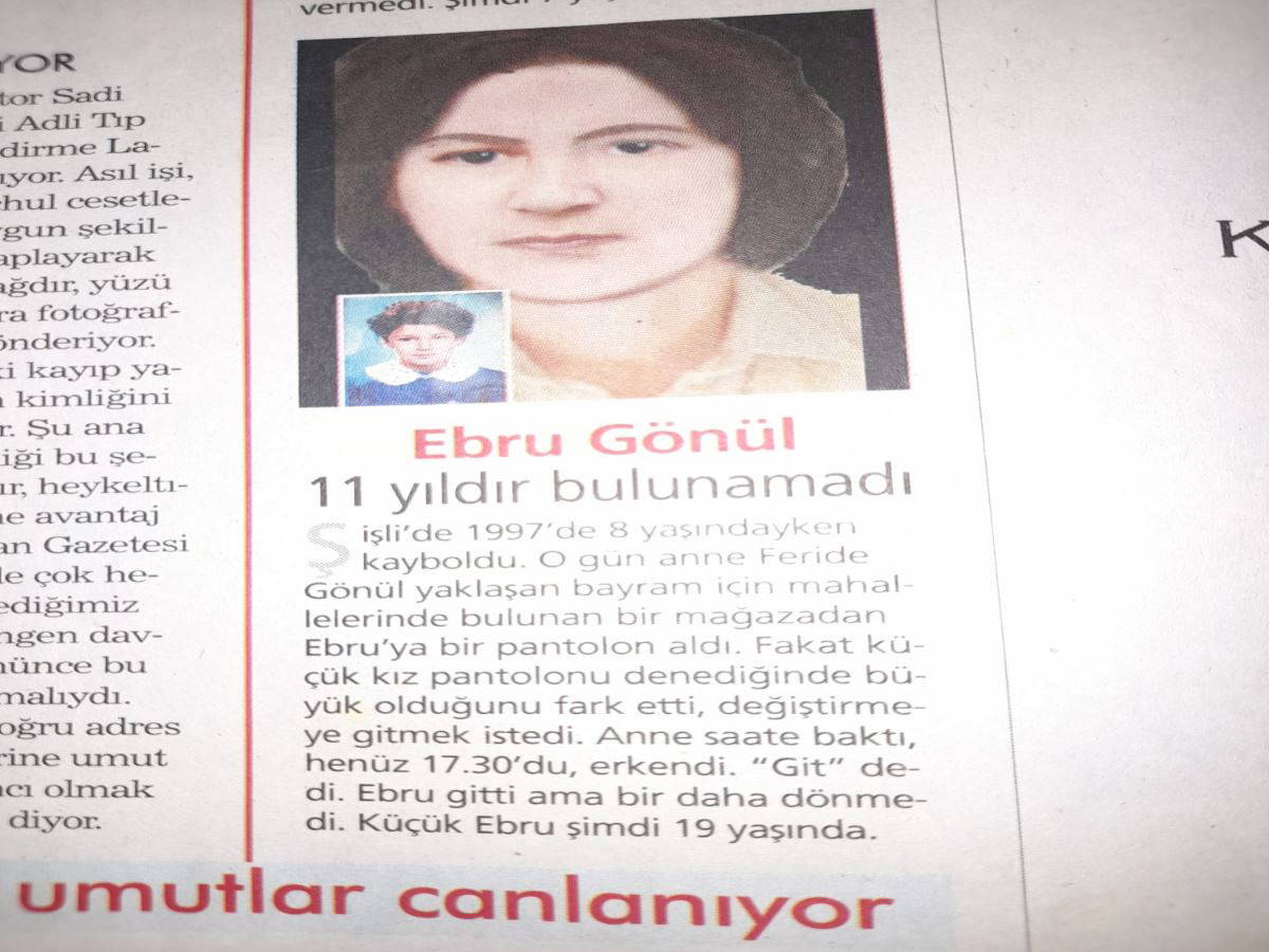Sekiz yaşındaki Ebru Gönül, 1997 yılında Şişli'de, yaşadığı mahallede kayboldu. Annesinin kendisine hediye olarak aldığı pantolonu değiştirmek için tuhafiyeye giden ve sonrasında geri gelmeyen Ebru'yu, annesi Feride,kaybolduğu günden beri arıyor. Kızının çok akıllı olduğunu, çağıran yabancı kişilere asla gitmeyeceğini ve kaçırıldığını düşündüğünü belirten Feride Gönül, 24 yıldır çocuğu için arama çalışmalarına devam ediyor.