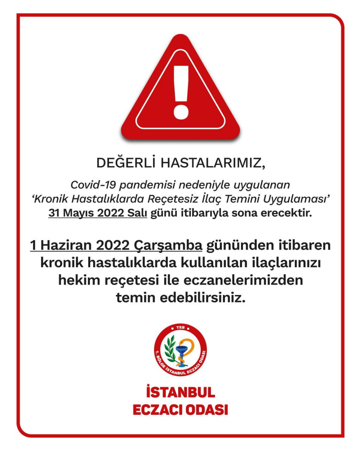 İstabul Eczacı Odası'da sosyal medya hesaplarından yaptıkları açıklama, "Kronik Hastalıklarda Reçetesiz İlaç Temini" uygulaması 31 Mayıs 2022 tarihinde sona eriyor. Kronik hastalıklarda kullanılan ilaçlar, 1 Haziran 2022 tarihinden itibaren hekim reçetesi ile eczanelerimizden temin edilebilecektir. Bilginize sunarız." dedi.