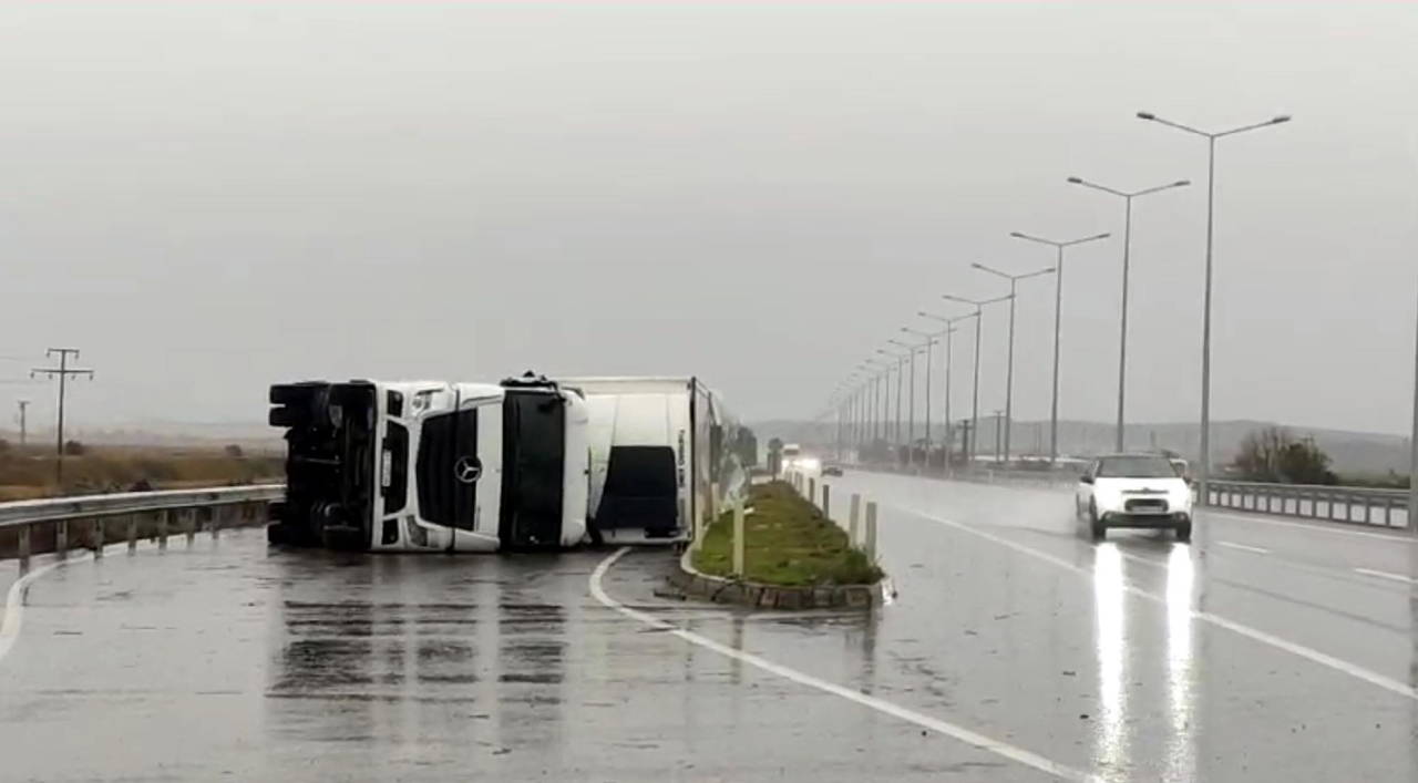 Edirne'nin İpsala ilçesinde gece yarısından itibaren etkisini sürdüren kuvvetli rüzgar nedeniyle Yunanistan'a açılan İpsala Sınır Kapısı yakınlarında emniyet şeridinde park halindeki bir TIR devrildi.