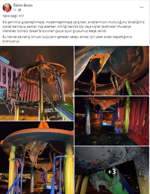Muradiye Mahallesi Sümbül Sokak'ta bulunan çocuk parkında, önceki gün saat 22.30 sıralarında oyun grupları kimliği belirsiz kişi ya da kişiler tarafından ateşe verildi. Yangını görenler, durumu itfaiyeye bildirdi.