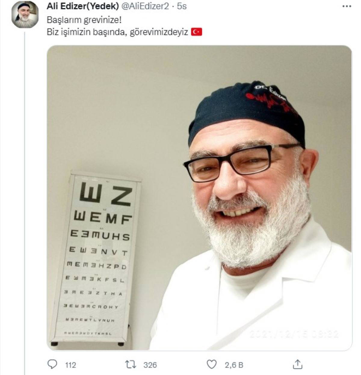 Kişisel Twitter hesabından fotoğraf paylaşan Edizer, "Başlarım grevinize! Biz işimizin başında, görevimizdeyiz" sözleriyle sağlık emekçilerini hedef aldı.