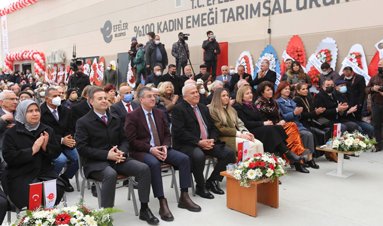 Aydın'da Efeler Belediyesi'nin yüzde 100 kadın emeğiyle çalışacak Tarımsal Ürün Fabrikası’nın açılışı gazeteci Özlem Gürses’in sunumuyla yapıldı. Tepecik Mahallesi’nde 1200 metrekare kapalı alan üzerine kurulan çok amaçlı gıda üretim fabrikasının açılışına Efeler halkı da yoğun ilgi gösterdi.