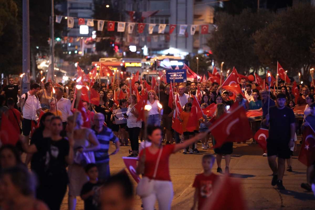 Dünya tarihinde eşine az rastlanır bir kahramanlık destanın yazıldığı Büyük Taarruz ve Başkomutanlık Meydan Muharebesinin 101.yılında Narlıdere’de yurttaşlar fener alayı Ulu Önder Gazi Mustafa Kemal Atatürk ve Cumhuriyetimizin ölümsüz koruyucularını andı. Yürüyüşte zafer şarkıları hep bir ağızdan söylenirken, bazı vatandaşlar büyük coşkuya evlerinin balkonlarından ortak oldu. Ellerinde bayraklarla Eski Güzel Sanatlar Fakültesi önünden Demokrasi Meydanı’na kadar Zafer Yürüyüşü gerçekleştiren binlerce vatandaş, 101 yıl önce yakılan bağımsızlık meşalesinin hiçbir zaman sönmeyeceğini yedi düvele haykırdı.