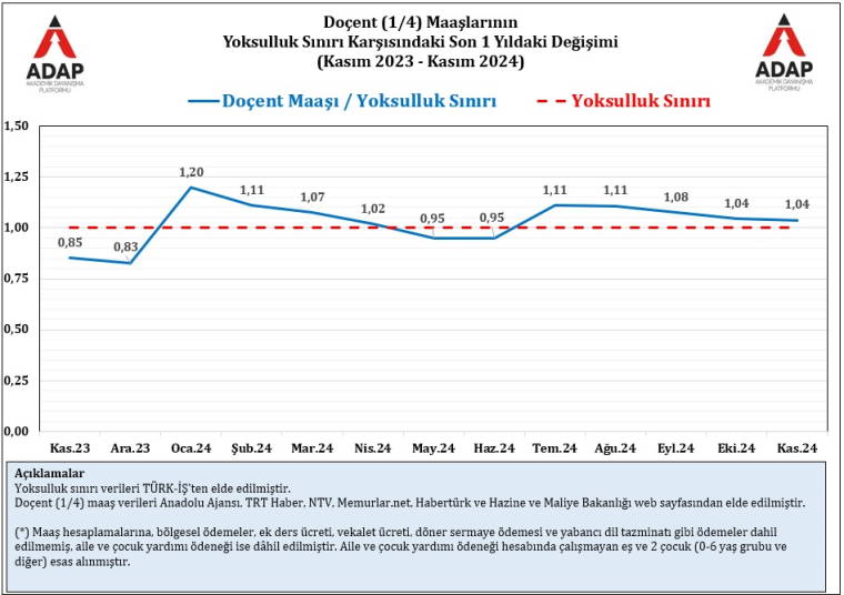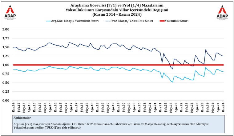 2022-2024 yılları arasında araştırma görevlisi sayısı yüzde 19 oranında azalış gösterdi. Akademik Dayanışma Platformu (ADAP) verilerine göre, son 10 yılda araştırma görevlisi maaşları Türk-İş yoksulluk sınırı üzerine hiç çıkmadı. 2022-2023’te profesör maaşları bir dönem yoksulluk sınırının altına düştü.