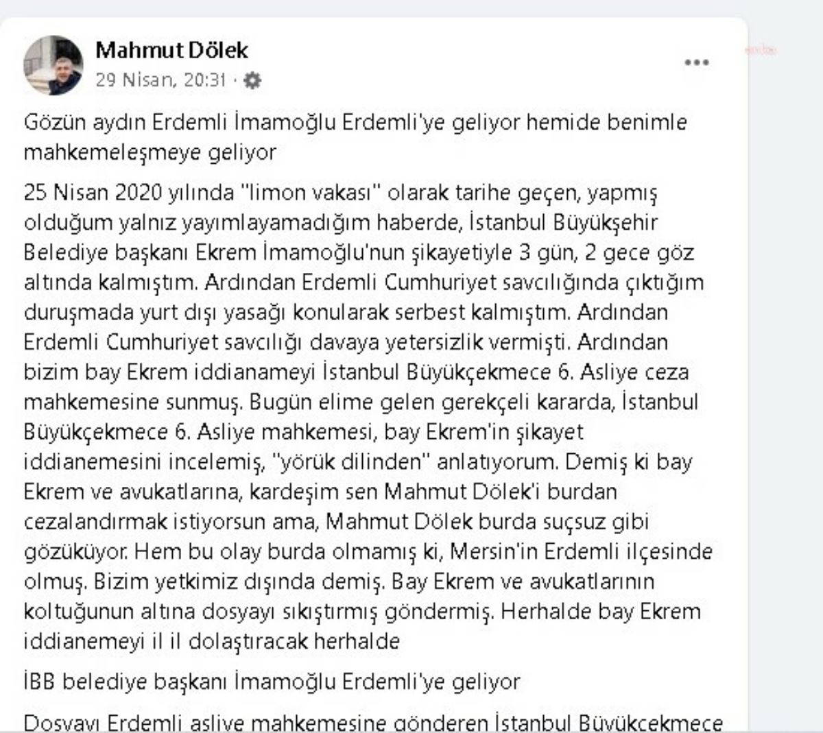 Mersin Büyükşehir Belediye Başkanı Vahap Seçer'in önerisi ile harekete geçen İstanbul Büyükşehir Belediye Başkanı Ekrem İmamoğlu, 100 ton limonu Mersinli üreticiden satın alıp, dağıtımını yapmıştı. Limon üreticisiyle konuşup, konuyu haberleştirmek isteyen kameraman Mahmut Dölek, üreticiyi kendi yönlendirmeleriyle konuşturup yanlış bilgiler vermeye zorlayarak kurmaca bir haber yapmıştı.