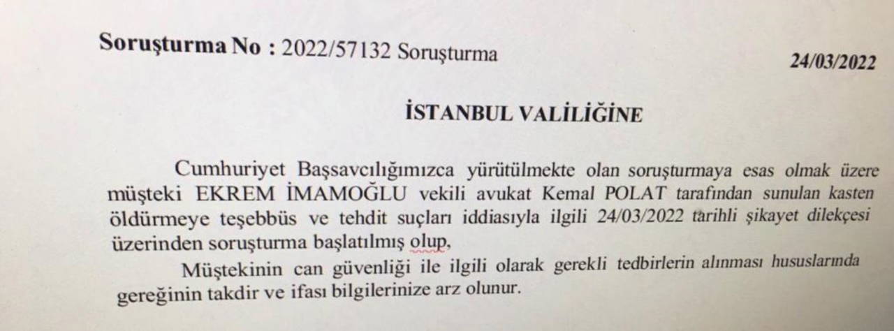 İhbar mektubunun İBB'ye ulaşmasının ardından İmamoğlu'nun avukatlarından Kemal Polat İstanbul Cumhuriyet Başsavcılığı ve İstanbul Valiliği'ne konu ile ilgili şikayette bulundu.