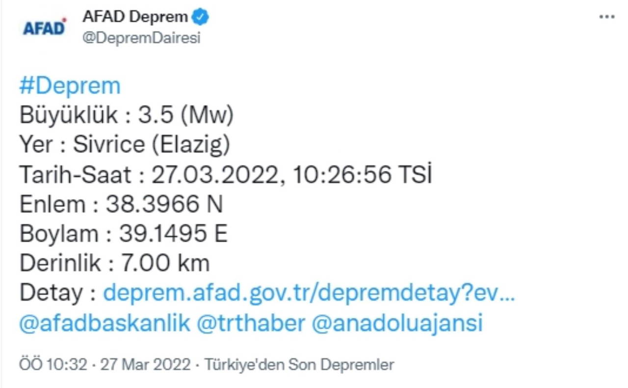 Afet ve Acil Durum Yönetimi Başkanlığı Deprem Dairesi Başkanlığı (AFAD) verilerine göre Elazığ'da saat 10.36'da bir deprem meydana geldi.