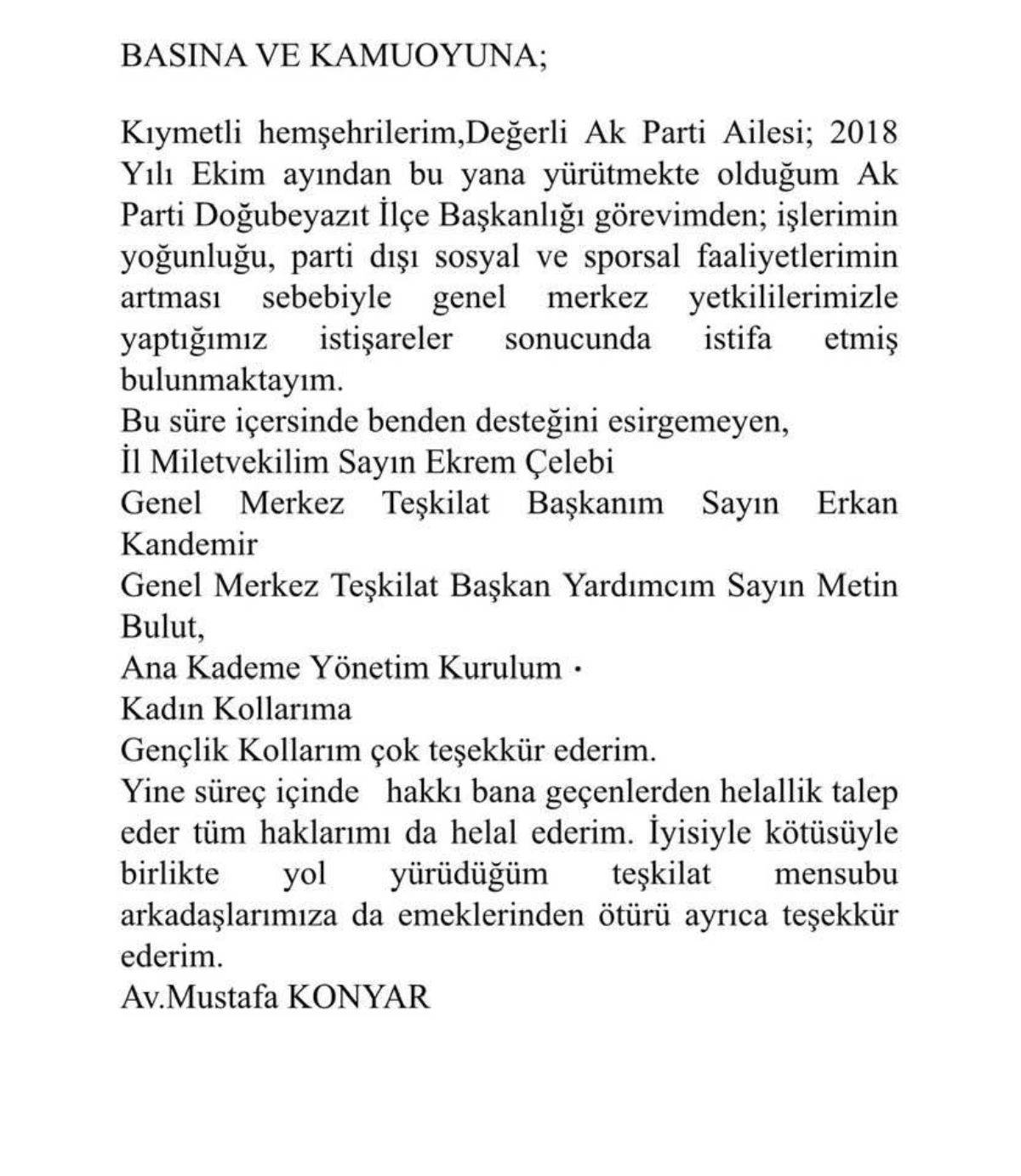 Doğubayazıt AKP İlçe Başkanı Mustafa Konyar istifa etti.