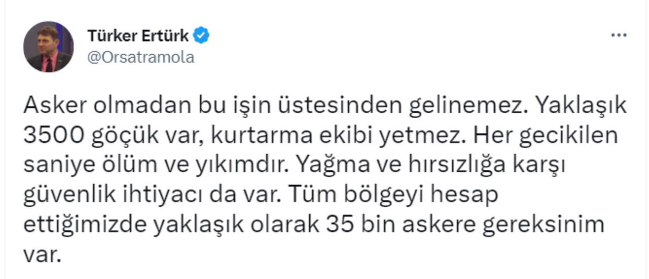 Ertürk, "Asker olmadan bu işin üstesinden gelinemez. Yaklaşık 3500 göçük var, kurtarma ekibi yetmez. Her gecikilen saniye ölüm ve yıkımdır. Yağma ve hırsızlığa karşı güvenlik ihtiyacı da var. Tüm bölgeyi hesap ettiğimizde yaklaşık olarak 35 bin askere gereksinim var” paylaşımı yaptı.
