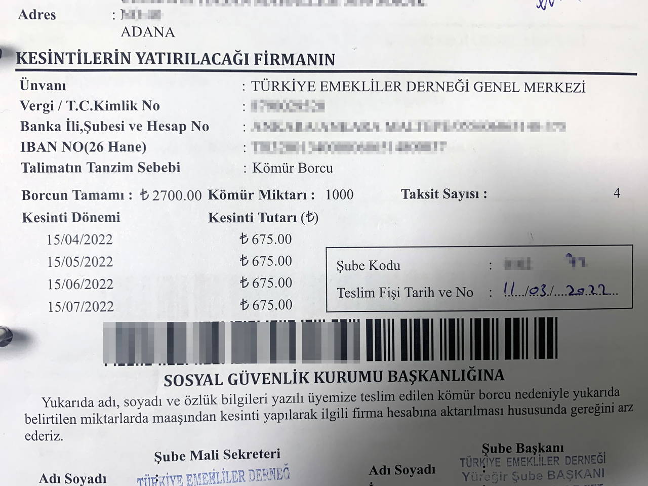 İl Emniyet Müdürlüğü Kaçakçılık ve Organize Suçlarla Mücadele Şube Müdürlüğü ekipleri, Türkiye Emekliler Derneği Yüreğir Şubesi yöneticilerinin, tefecilik yaparak haksız kazanç sağladıkları iddiası üzerine harekete geçti. Ekipler, şüphelilere yönelik dün şafak vakti operasyon düzenledi. Yapılan eş zamanlı baskınlarda Yüreğir Şube Başkanı A.Ç., genel sekreter A.B., sayman A.B., sekreter İ.Y. ile odun ve kömür satışı yapan bir firmanın işletmecisi Y.Y. gözaltına alındı. Adreslerde yapılan aramalarda dernek üyesi emeklilere ait çok sayıda maaş kesinti belgesi, 21 emekli kimlik kartı ile alacak notlarının bulunduğu defter ve dijital materyal ele geçirildi.