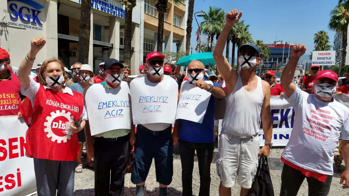 Türkiye’de ekonomik kriz derinleşirken emekliler açlık sınırı altında maaşlıklarını protesto etmek için meydanlara indi. Devrimci İşçi Sendikaları Konfederasyonu (DİSK) Emekli-Sen üyeleri, İzmir’in Konak Meydanı’nda SGK İzmir İl Müdürlüğü önünde enflasyon karşısında yaşadıkları tabloyu sahneledikleri mizansen ile anlattı. Gösteride bir emekli elinde orakla ‘enflasyon canavarı’ olarak canlandırırken diğer emekliler de üzerlerinde ‘Emekliyiz, Açız’ yazılı giysiler ve “Emeklilerin sesi kısılmak isteniyor” mesajı içeren ağızlarındaki bantlar ile yere yattılar. Bir grup emekli de şort ve atletle eyleme katıldı.