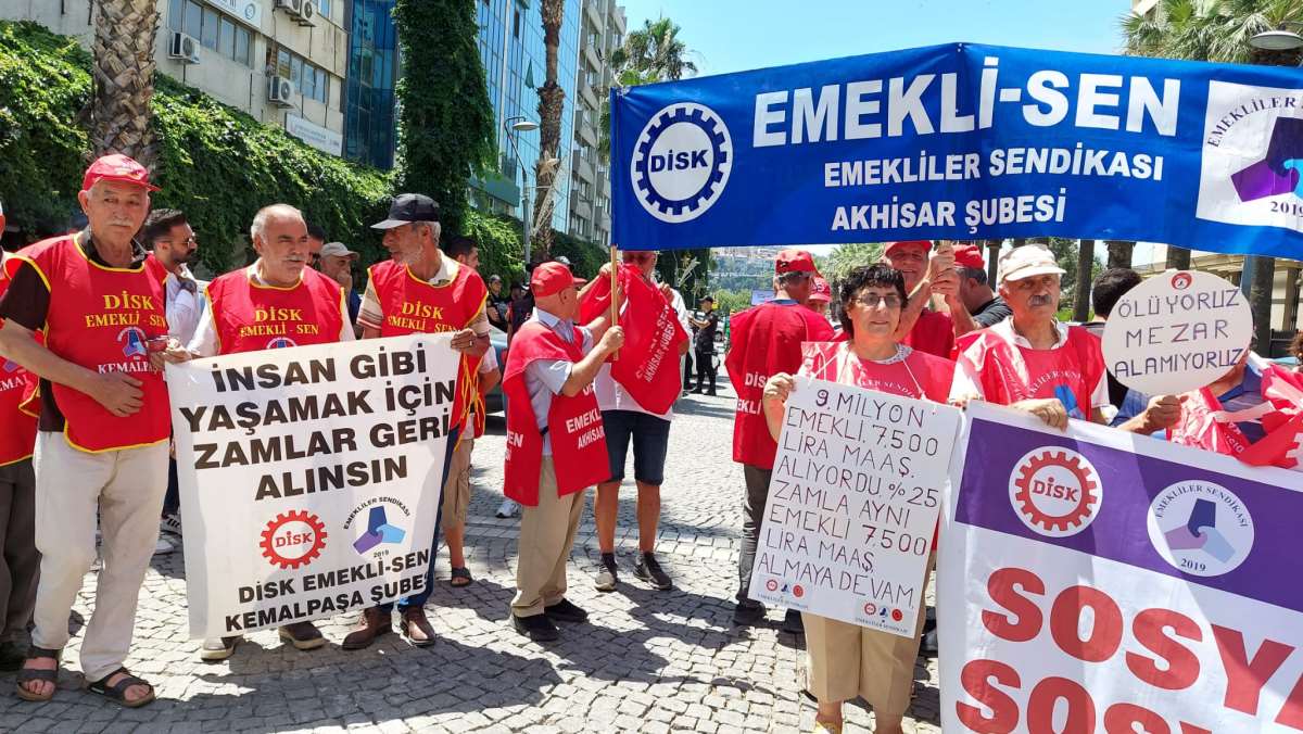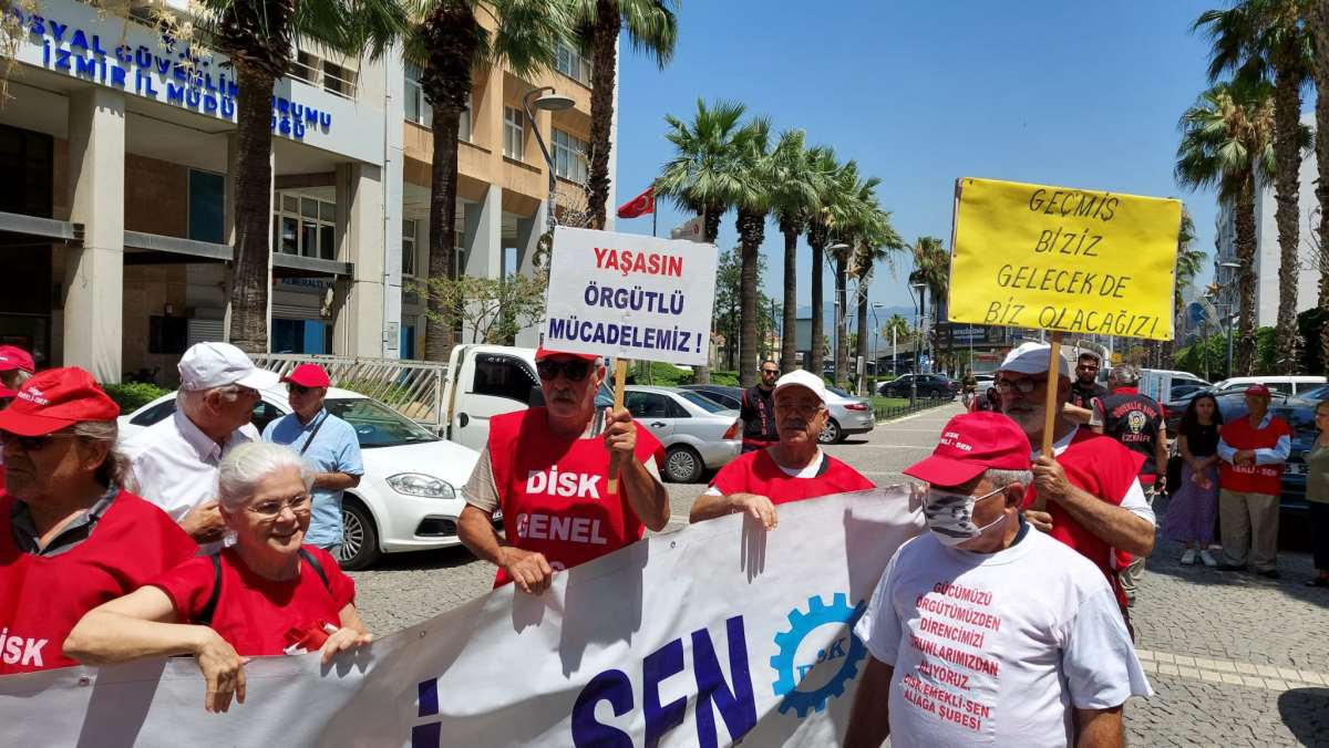 Basın açıklamasını okuyan DİSK Emekli-Sen Ege Bölge Temsilcisi Sabahattin Yeşiltepe, TÜİK’in enflasyon rakamlarının gerçeği yansıtmadığını belirterek “TÜİK’in halkın ekmeğini korumak değil küçültmek için dört işleme takla attırarak açıkladığı ve işçilerin, memurların, emeklilerin sürekli biçimde yoksullaşmasına neden olan gerçek dışı enflasyon oranları neticesinde biz emeklilerin Temmuz-Aralık 2023 dönemi zammı da refah payı adı altında yapılan birkaç puanlık ekleme ile yüzde 25 olarak belirlendi. Bugün resmi enflasyon ile gerçek enflasyon oranları arasındaki bu derin fark, yoksulluğun da derinleşmesine neden olmaktadır. Artık eskiyen ve anlamını tümüyle yitirerek boş bir vaat haline gelen ‘emeklilerimizi enflasyona ezdirmeyeceğiz’ söylemlerinin ardında milyonların açlık sınırının altında yaşam mücadelesi verdiği bir ekonomik ortam bulunmaktadır” dedi.