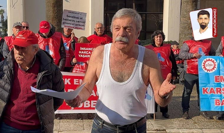 DİSK Emekli Sen Ege Bölge Temsilcisi Sabahattin Yeşiltepe, “Emeklinin hali bu” diyerek soğuk havada üstünü çıkarırken yurttaşlar “Onurlu bir yaşam istiyoruz”, “Hak hukuk adalet”, “Saraya değil emekçiye bütçe”, “Birleşe birleşe kazanacağız” sloganları attı.