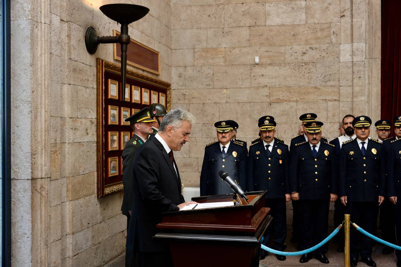 "İstiklal mücadelemizin Başkomutanı, Cumhuriyetimizin banisi Büyük Önder Gazi Mustafa Kemal Atatürk; ilham ve kuvvet kaynağını milletin kendisi görerek bağımsızlık mücadelemize ettiğiniz rehberlikle kurduğunuz ve en değerli emanetiniz olan Türkiye Cumhuriyeti'mizi yüceltme ve yükseltme azim ve kararlılığındayız. Emniyet teşkilatı olarak, dünyanın saygın teşkilatları arasındaki yerimizi sağlamlaştırma, teknik ve beşeri kapasitemizi güçlendirerek iç ve dış güvenliğimize yönelik tehditleri ortadan kaldırma ve elbette 85 milyonun huzur ve güvenliğini sağlama noktasında büyük bir gayret ortaya koymaktayız."