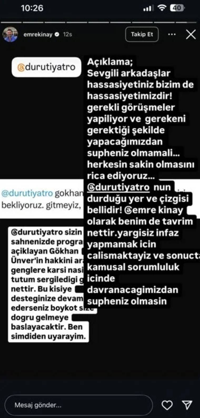 Tiyatro ve dizi oyuncusu Emre Kınay, kurucusu olduğu Duru Tiyatro'da sahne alacak olan Gökhan Ünver'e yönelik tepkilere yanıt verdi.
