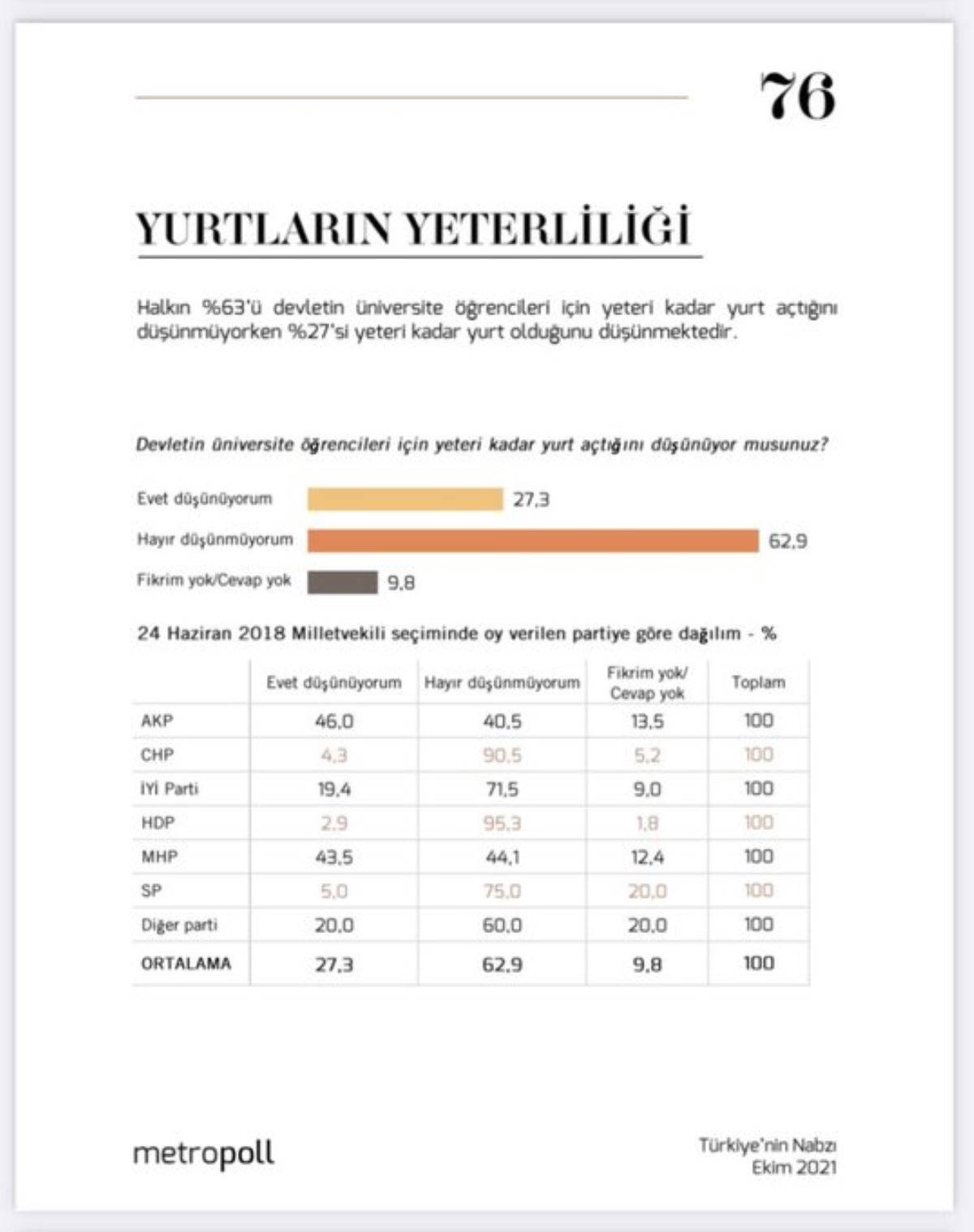 Yapılan çalışmada, yurttaşlara devlet yurtlarının yeterli olup olmadığı soruldu. Sencar'ın açıkladığı ankete göre, yurttaşların yüzde 63'ü devletin üniversite öğrencileri için yeterli sayıda yurt açmadığını düşünüyor. Yüzde 27'lik bir azınlık ise açılan devlet yurtlarını yeterli buluyor.