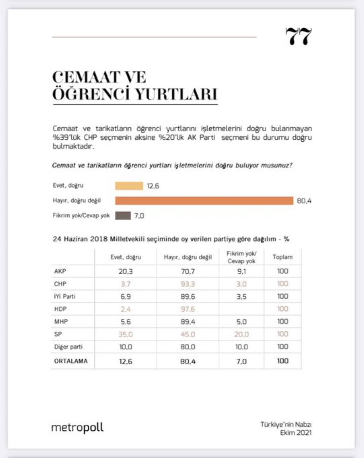 Açıklanan ikinci ankette ise cemaat ve tarikatların öğrenci yurtları işletmelerinin yurttaşlar tarafından doğru bulunup bulunmadığı soruldu. Yurttaşlar, yüzde 80'in üstünde bir oranla cemaat ve tarikatların yurtları işletmesini doğru bulmadığını belirtti.