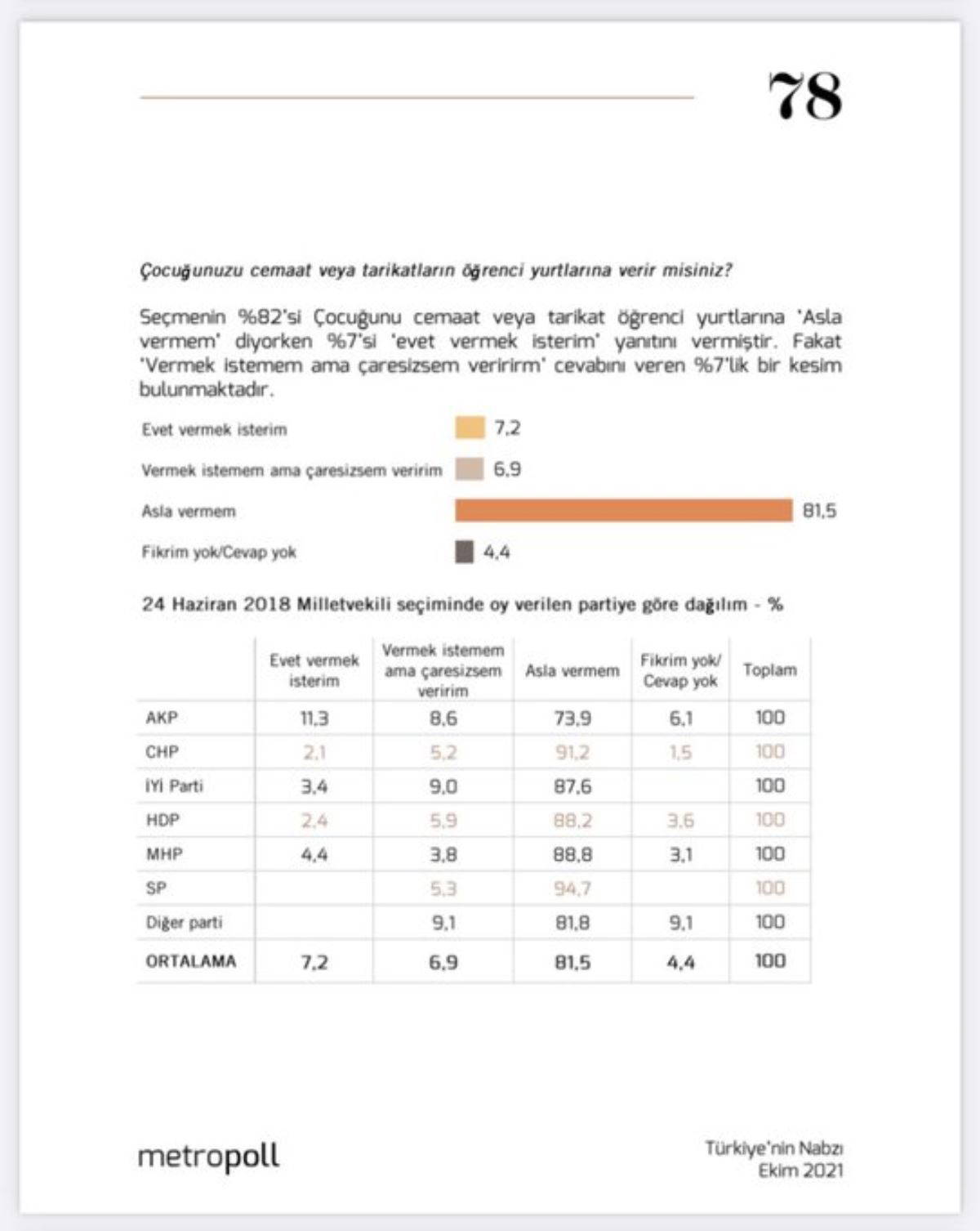 Sencar'ın açıkladığı son ankette ise yurttaşların çocuklarını cemaat ve tarikatlarına vermek isteyip istemediği soruldu. Yurttaşlar bu soruya yüzde 81.5 oranla 'asla vermem' yanıtı verdi.
