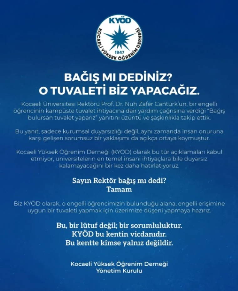 Kocaeli Yüksek Öğrenim Derneği, Kocaeli Üniversitesi Rektörü Cantürk'ün bu yanıtına tepki göstererek açıklama yaptı.