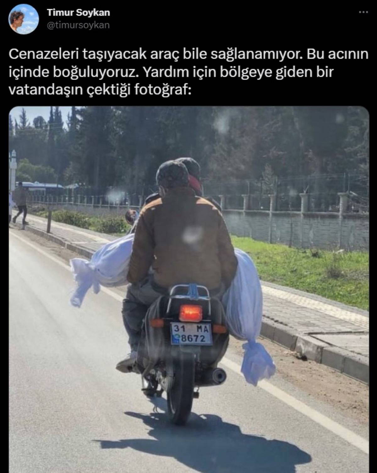 Bir yurttaşın çektiği fotoğrafı kendi sosyal medya hesabından paylaşan Soykan, "Cenazeleri taşıyacak araç bile sağlanamıyor. Bu acının içinde boğuluyoruz. Yardım için bölgeye giden bir vatandaşın çektiği fotoğraf" notunu düştü.