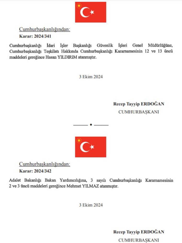 AKP Genel Başkanı ve Cumhurbaşkanı Erdoğan'ın imzasıyla yayımlanan Resmi Gazete'de iki göreve yeni atama yapıldı.