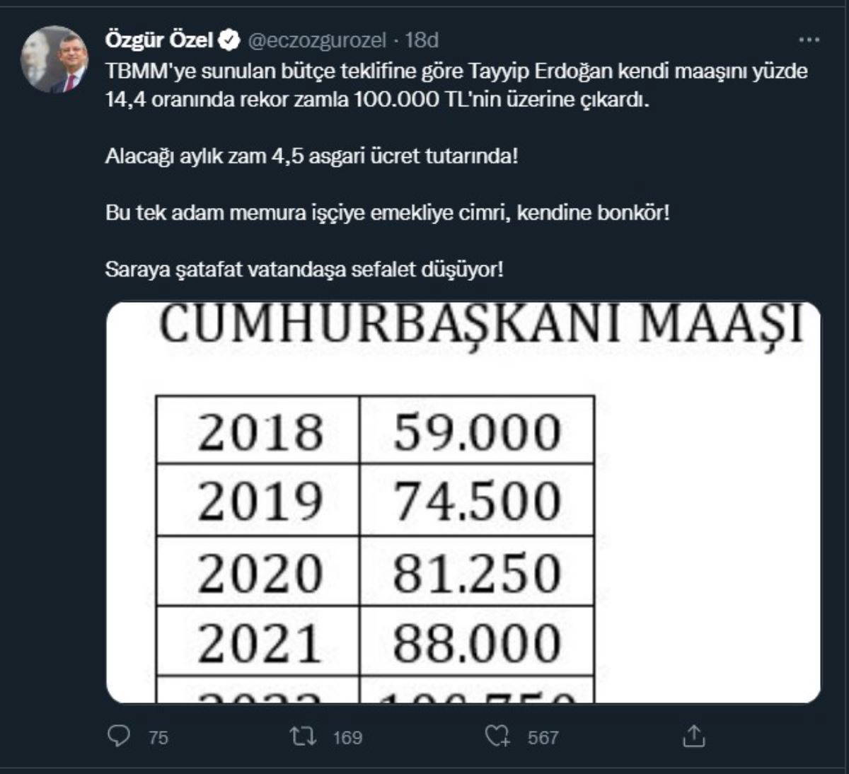CHP Grup Başkanvekili Özgür Özel, TBMM'ye sunulan bütçe teklifinin Erdoğan hakkındaki ayrıntısını paylaştı. Teklif kabul edilirse, 2021 bütçesinde 88 bin TL olan Cumhurbaşkanlığı maaşı 100 bin TL olarak belirlenecek.