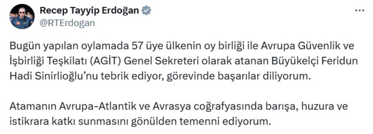 Erdoğan, sosyal medya hesabı üzerinden Avrupa Güvenlik ve İşbirliği Teşkilatı (AGİT) Genel Sekreteri olarak atanan Büyükelçi Feridun Hadi Sinirlioğlu’nu tebrik etti.