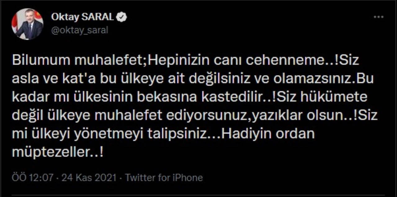 Saral, Twitter hesabından yaptığı paylaşımda, “Hepinizin canı cehenneme!”, “Müptezeller” gibi ifadeler kullandı.